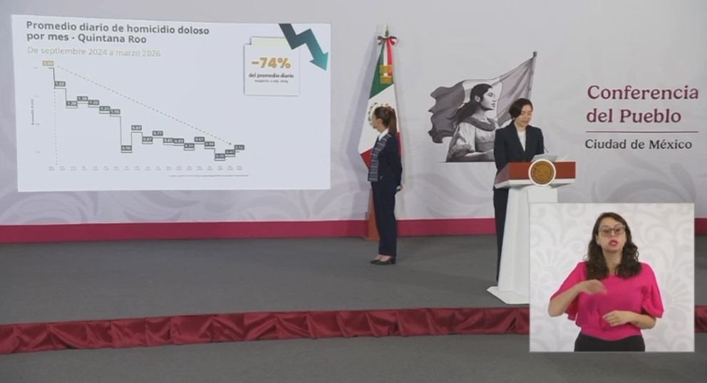 CIUDAD DE MÉXICO.- Quintana Roo mantiene una tendencia sostenida a la baja en homicidios dolosos, al registrar un promedio diario de 0.52 casos en marzo de 2026, lo que representa una disminución del 74 por ciento frente a los 2 casos diarios reportados en septiembre de 2024, informó la titular del Secretariado Ejecutivo del Sistema Nacional de Seguridad Pública (SESNSP), Marcela Figueroa Franco.